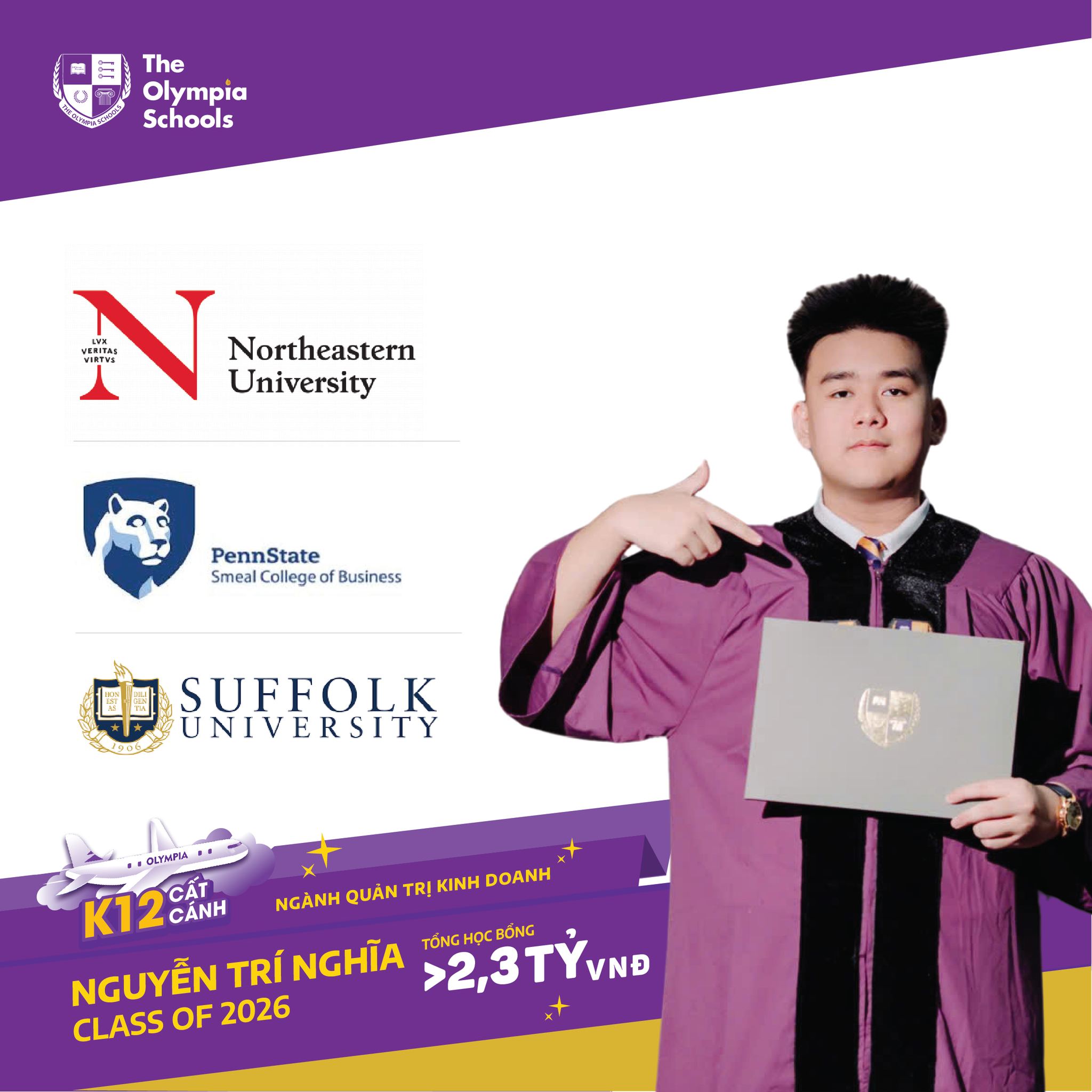 Đó là chia sẻ của Nguyễn Trí Nghĩa - Olympian gắn bó với “trường Tím” suốt 12 năm và vừa khép lại mùa nộp hồ sơ du học bằng những kết quả đáng tự hào. Em trúng tuyển vòng quyết định sớm (ED1) vào Northeastern University - Top 50 đại học hàng đầu nước Mỹ, đồng thời nhận thư mời từ Penn State - Smeal College of Business và Suffolk University, với tổng giá trị học bổng hơn 2,3 tỷ đồng.