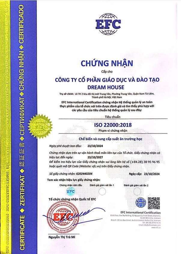 Trong hành trình không ngừng mang đến những bữa ăn an toàn, giàu dinh dưỡng và chất lượng cho học sinh, bếp ăn đã đạt được một dấu mốc quan trọng: chính thức đạt chứng nhận Hệ thống quản lý an toàn thực phẩm theo tiêu chuẩn ISO 22000:2018. Đây là minh chứng rõ nét cho những nỗ lực và cam kết bền bỉ của nhà trường trong việc đảm bảo mỗi bữa ăn đều đạt tiêu chuẩn quốc tế về chất lượng và an toàn thực phẩm.