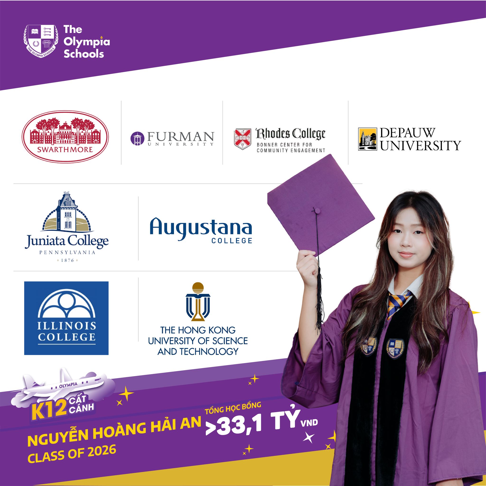 Mùa nộp hồ sơ du học chỉ mới đi được một nửa, nhưng Nguyễn Hoàng Hải An ghi dấu ấn mạnh mẽ khi trúng tuyển 8 đại học hàng đầu nước Mỹ, với tổng học bổng hơn 33,1 tỷ đồng. Nổi bật trong số đó là thư mời và học bổng gần 7 tỷ đồng từ Swarthmore College - top 4 đại học khai phóng danh giá bậc nhất nước Mỹ - ngôi trường nổi tiếng với môi trường học thuật khắt khe, tư duy phản biện sâu sắc và tinh thần nhân văn mạnh mẽ.