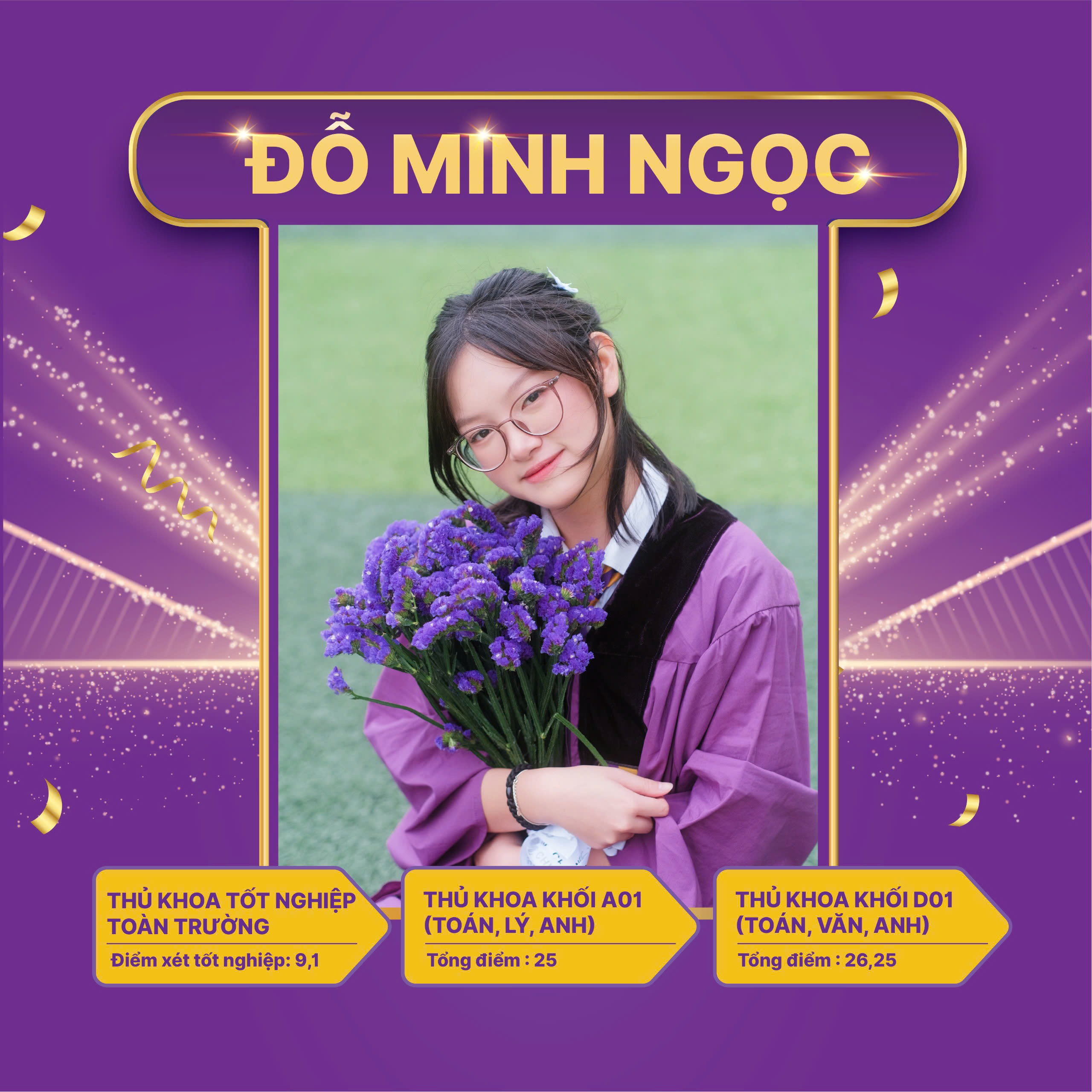 Và chúc mừng Thủ khoa tốt nghiệp của toàn trường năm nay - Đỗ Minh Ngọc với 9,1 điểm xét công nhận tốt nghiệp. Olympian này cũng “ẵm” luôn danh hiệu thủ khoa 2 khối của trường là A01 (Toán, Lý, Anh) và D00 (Toán, Văn, Anh) với tổng điểm các khối lần lượt là 25 và 26,25. Á khoa tốt nghiệp toàn trường là Đỗ Gia Phúc với 9,0 điểm xét công nhận tốt nghiệp.