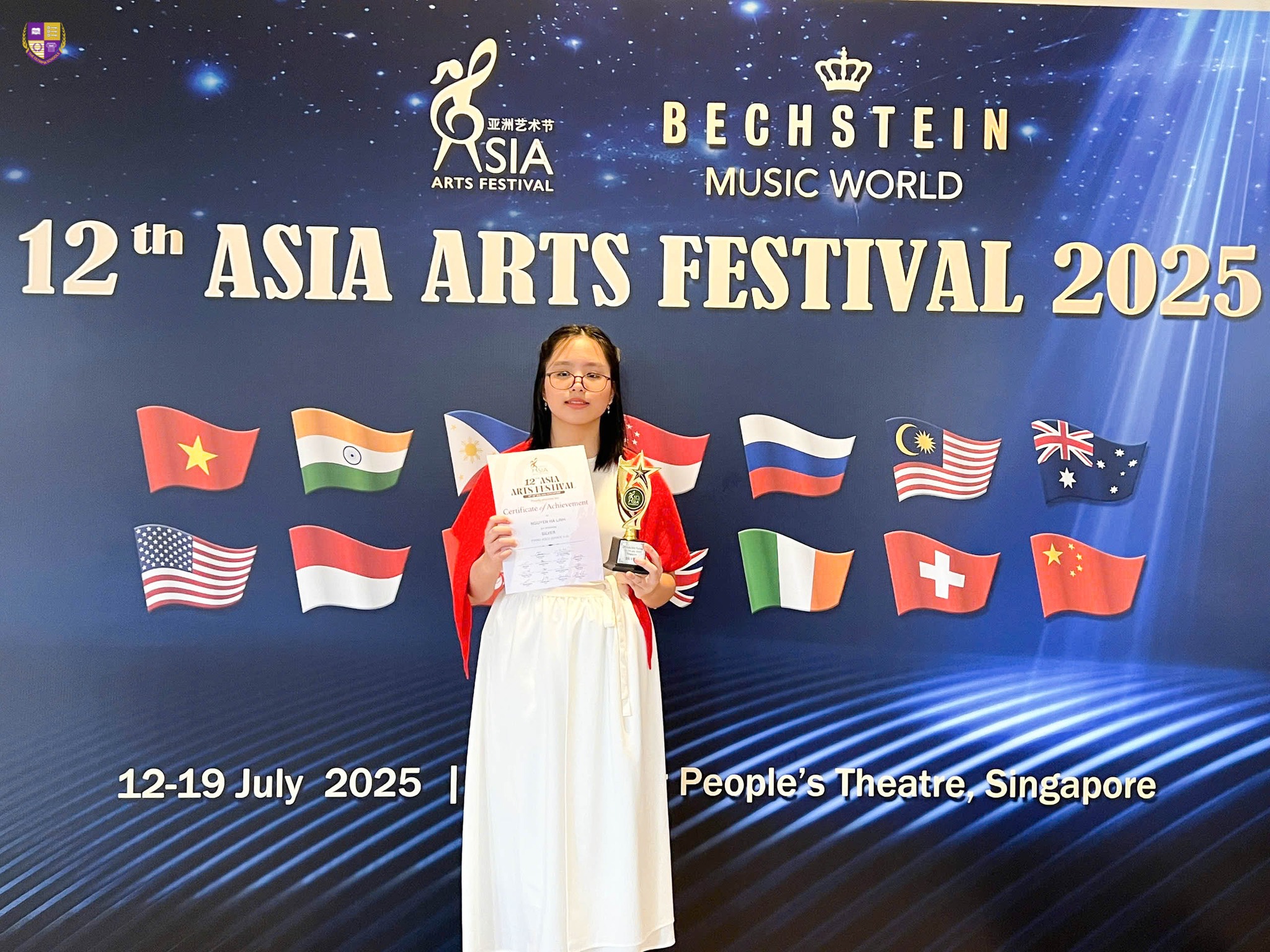 Chúc mừng: Phạm Đức Long (lớp 6H3) với 2 Cúp Vàng ở cả hai hạng mục Hát và Piano - thành tích đặc biệt xuất sắc tại sân chơi nghệ thuật quốc tế nổi tiếng khắt khe và có tính cạnh tranh cao; Phạm Ngọc Diệp (lớp 2A2) với cúp Bạc - hạng mục Hát; Nguyễn Hà Linh (lớp 6H1) đạt cúp Bạc - hạng mục Piano.